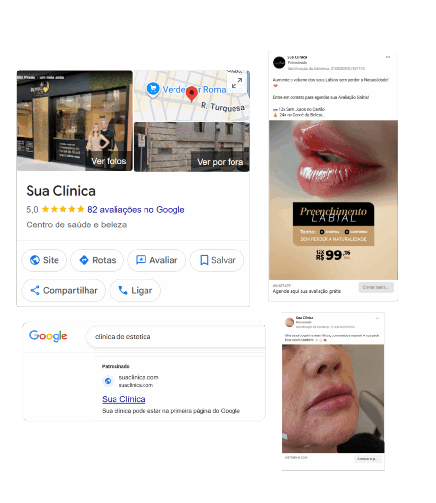 Criamos campanhas para atrair novos clientes e aumentar a procura pelos seus procedimentos, com criativos e segmentações pensadas para estética.